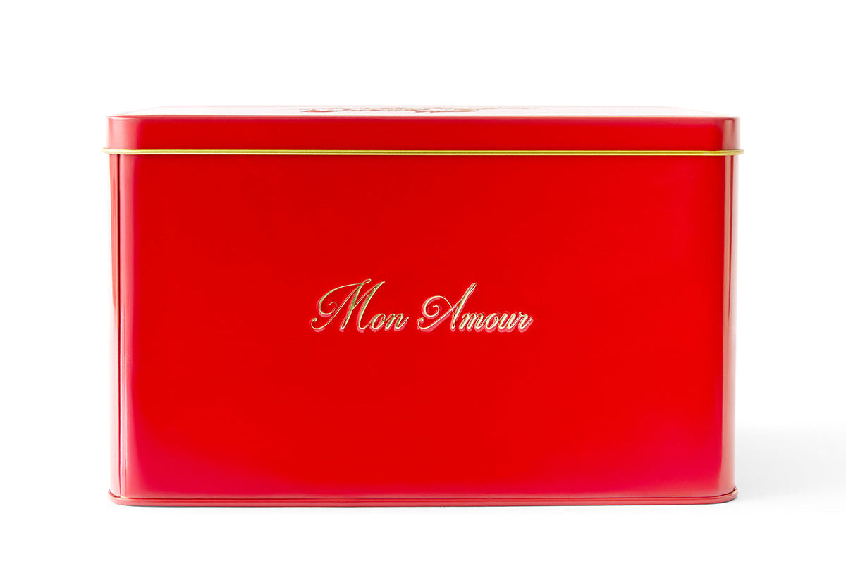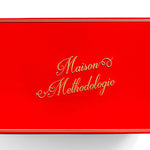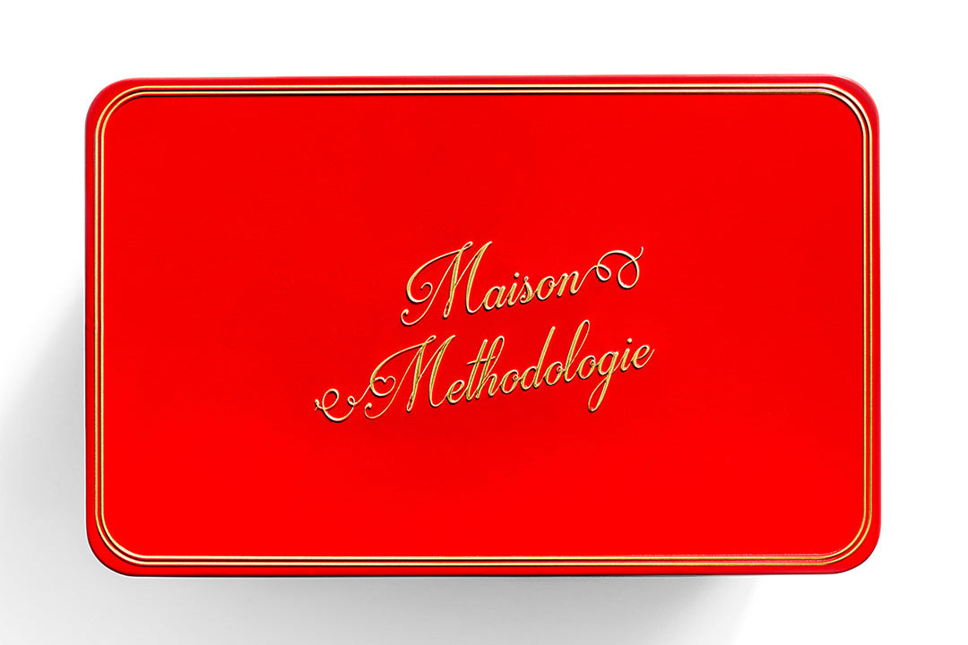 Valentine’s Tin: This dozen tin is in glossy red with clean gold trim. The Maison Methodologie logo is stamped in gold on the lid, with simple gold lettering along the sides, making it well suited for gifting, sharing, or presentation on a counter or shelf after use.